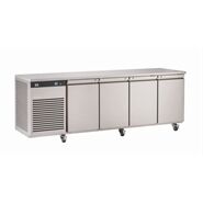 High capacity four door counter from Foster, finished in sturdy stainless steel and with robust castors to ensure easy movement. Features high quality components, lockable doors, a slide-out refrigeration system and an easy-clean interior. Ideal for busy kitchens that need a large amount of extra refrigerated storage and workspace.